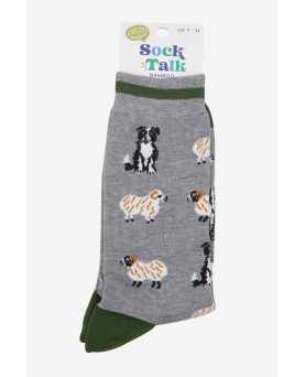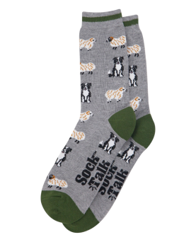 10,00 €Calcetines de media pantorrilla en gris jaspeado con ovejas y border collie. Fabricados con suave fibra de bambú, estos calcetines de vestir ofrecen máxima comodidad y transpirabilidad. Presentan un clásico puño a rayas.