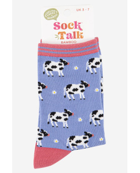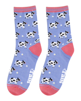 10,00 €Calcetines de bambú para mujer con temática de animales de granja con un patrón repetido de vaca, terminados con un puño de rayas.