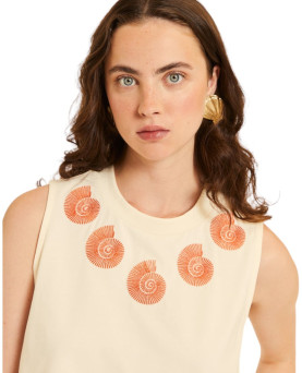 32,00 €Camiseta en color beige con bordado de caracolas en color coral. Sin mangas. Cuello redondo. Largo por la cintura. Corte recto amplio