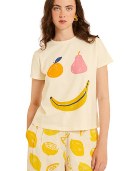 27,90 €Camiseta en color beige con estampado de cara hecho con frutas. Manga corta. Cuello redondo. Largo por la cintura. Corte recto amplio