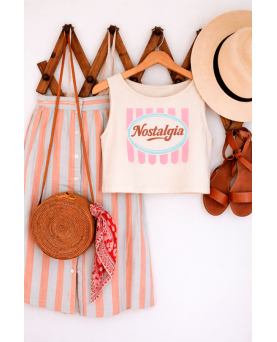 41,95 €Camiseta crop en color blanco roto con la frase nostalgia que te recordará a los helados que comías en tu infancia. Largo por encima de la cinturas sin mangas y corte cuadrado. Te recomendamos que escojas tu talla habitual. si te gusta el estilo de corte cuadrado, si no elije una talla menos.