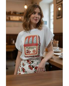 Confeccionada en algodón suave y cómodo, es una prenda ideal para el día a día. Su corte relajado y su estilo creativo la convierten en una camiseta perfecta para mujeres que buscan moda diferente, divertida y con personalidad.