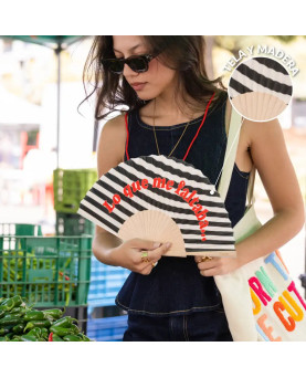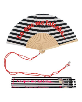 El abanico azul de rayas con el mensaje rojo le dará a tus “looks” veraniegos un toque fresco y colorido. Además, incluye un práctico colgador para que puedas tenerlo siempre a mano y que no se te pierda ni se te olvide. ¡Cuélgatelo y olvídate de rebuscarlo en tu bolso o mochila cuando necesites abanicarte!