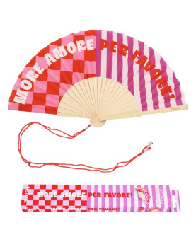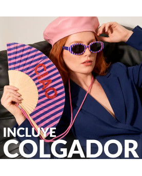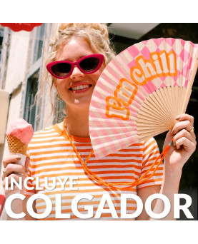 El abanico de rayas rosas y cuadros rosas con su mensaje en naranja que le darás a tus looks colorido que te hará llamar la atención allá donde vayas. Además, incluye un práctico colgador para que puedas tenerlo siempre a mano y que no se te pierda ni se te olvide. ¡Cuélgatelo y olvídate de rebuscarlo en tu bolso o mochila cuando necesites abanicarte!