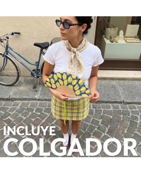 Este abanico amarillo con letras multicolor es ideal para darle a tus looks veraniegos un toque colorido que te hará llamar la atención allá donde vayas. Además, incluye un práctico colgador para que puedas tenerlo siempre a mano y que no se te pierda ni se te olvide. ¡Cuélgatelo y olvídate de rebuscarlo en tu bolso o mochila cuando necesites abanicarte!