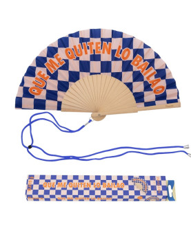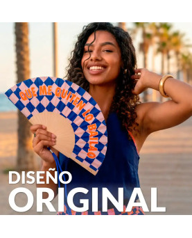 El abanico azul de cuadros con su mensaje naranja es perfecto para darle a tus “looks” veraniegos un toque retro y colorido. Además, incluye un práctico colgador para que puedas tenerlo siempre a mano y que no se te pierda ni se te olvide. ¡Cuélgatelo y olvídate de rebuscarlo en tu bolso o mochila cuando necesites abanicarte!