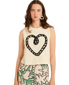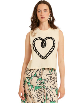 32,00 €Camiseta en color beige con estampado de corazón en color negro. Corte cuadrado con largo a la cintura. Sin mangas. Escote redondo.
