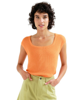 36,95 €Top con tejido de punto fino de color naranja. Escote cuadrado y manga corta. Detalles acabados en rib. La modelo mide 175 cm y lleva la talla S.