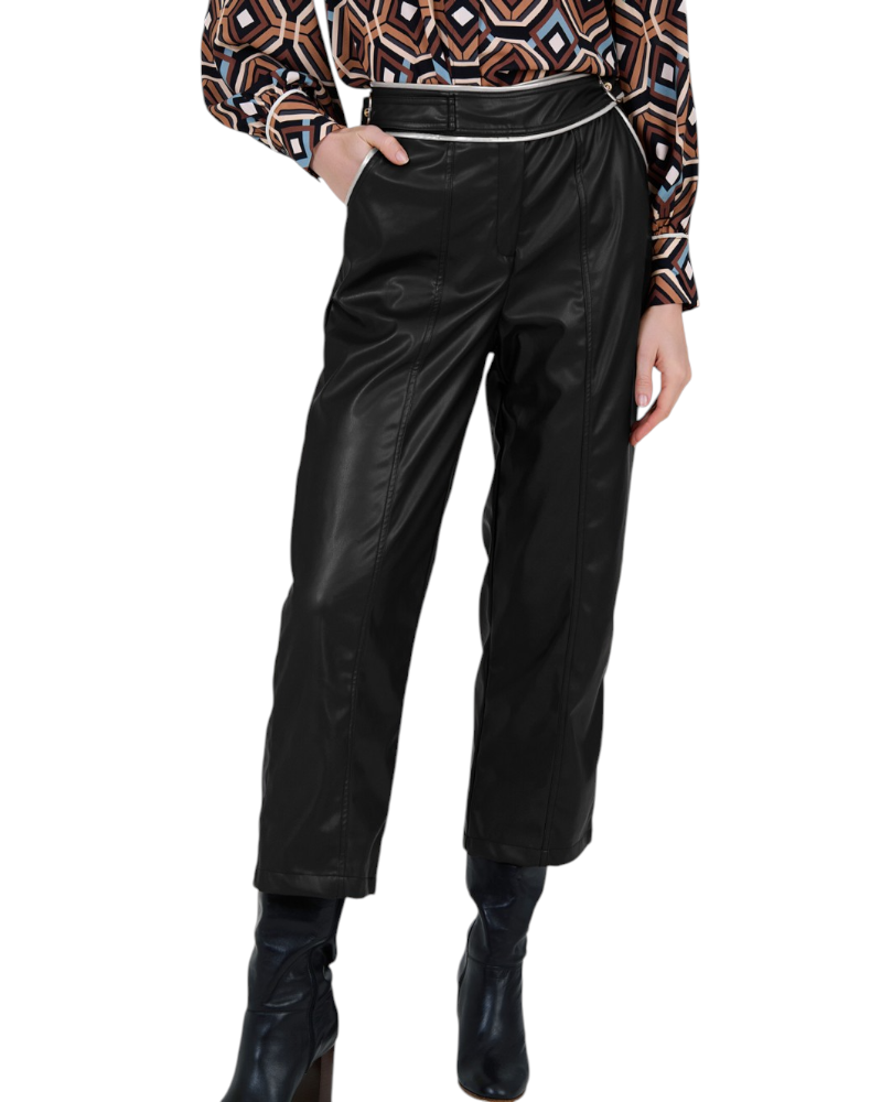 Pantalón recto de polipiel. Detalle de la cinturilla con hebillas doradas en los laterales.