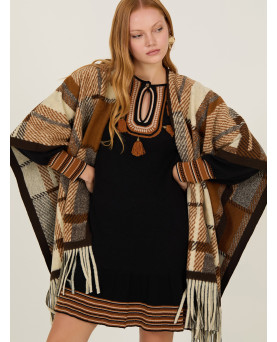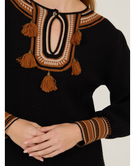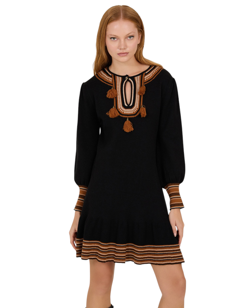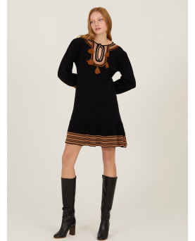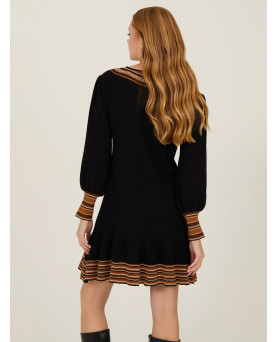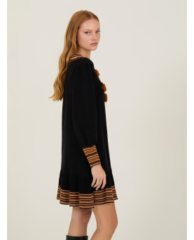 Vestido corto en punto de viscosa en color negro con franjas en tonos marrones. Detalles de pompones en el escote. Manga abullonada. Largo por encima de la rodilla. Corte entallado hasta la cintura y con vuelo en la cadera.