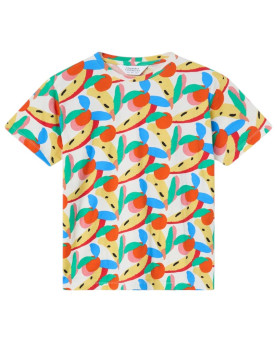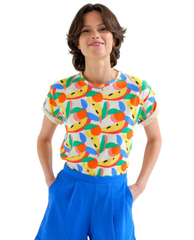 24,95 €Camiseta en color blanco con estampado de frutas. Cuello redondo y manga corta. Corte recto con largo a la cintra. La modelo mide 177 cm y lleva la talla S.
