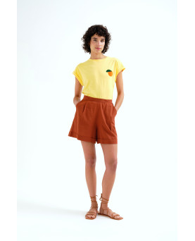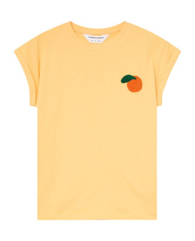 24,95 €Camiseta en color amarillo anaranjado con detalle de parche de una naranja en tejido de toalla. Manga corta con vuelta. Cuello redondo. Corte recto con largo a la cintura. La modelo mide 177 cm y lleva la talla S.