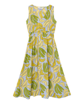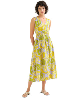 46,95 €Vestido midi de tejido estampado guineo. Escote pico y sin mangas. Detalle en cintura elástica. Bolsillos laterales. La modelo mide 175 cm y lleva la talla S.