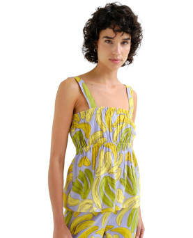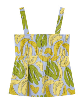 27,95 €Top de tejido 100% algodón con estampado guineo. Escote recto y tirantes gruesos. Detalle de ajuste elástico en el pecho. La modelo mide 175 cm y lleva la talla S.