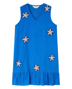 49,95 €Vestido de tejido 100% algodón de color azul marino con apliques de estrellas bordadas. Escote pico y sin mangas. Detalle de volantes en falda. Forro interior. La modelo mide 175 cm y lleva la talla S.