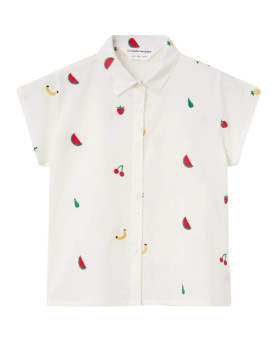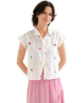 39,95 €Camisa de tejido 100% algodón de color blanco con bordado de ensalada de frutas. Cuello solapa y manga corta. Cierre frontal con botones de color blanco. La modelo mide 177 cm y lleva la talla S.