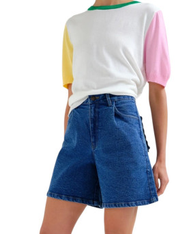 42,95 €Shorts de tejido denim de color azul. Cintura fija de tiro alto. Cierre con cremallera y botón. Bolsillos laterales y posteriores con detalle de ondas. Pernera recta. La modelo mide 175 cm y lleva la talla S.