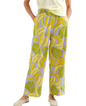 39,95 €Pantalón de tejido 100% algodón con estampado guineo. Cintura elástica de tiro medio. Pernera recta. Bolsillos laterales. La modelo mide 175 cm y lleva la talla S.