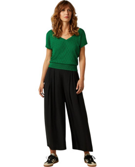 89,95 €Pantalón culotte en color negro. Pata ancha desde arriba con largo al tobillo. Tejido de viscosa con mucho movimiento perfecto para el calor. Bolsillos laterales. Cintura fija. Tela no elástica