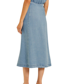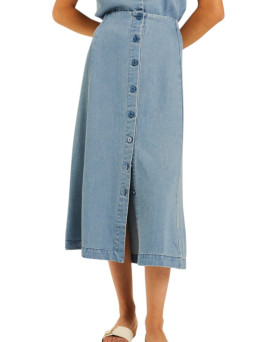65,00 €Falda denim confeccionada en tejido de tencel muy suave y fresco para el verano. Abotonada de la cintura al bajo. Largo midi. Con forma de A