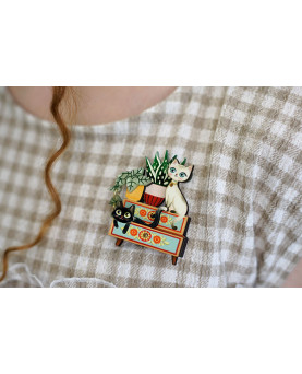 42,00 €Broche ilustrado con dos gatitos curiosos entre plantas, sobre un mueble de inspiración vintage con detalles florales. Ligero, original y perfecto para dar un toque especial a tus prendas. Las plantas crecen… y los gatos supervisan!