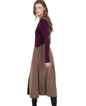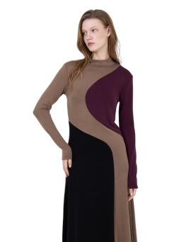 49,50 € -50% 99,00 €Vestido midi con tejido elástico mezcla de viscosa extrasuave. Cuello perkins y manga larga. Diseño tipo patchwork tricolor.