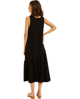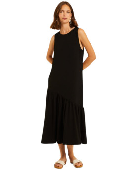 79,90 €Vestido en color negro con tejido de camiseta elástico. Corte recto pero no entallado con un volante al bies. largo por el tobillo. Un vestido muy cómodo y estiloso perfecto para el calor del verano