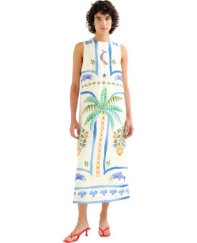 74,95 €Vestido largo de tejido de crepé con estampado palm & mermaid. Cuello redondo y sin mangas. Corte fluído.Forro interior. La modelo mide 175 cm y lleva la talla S.