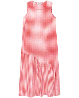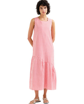54,95 €Vestido de cuadros vichy rojos. Corte recto sin ser entallado. Volante en el bajo en diagonal que le aporta un bonito movimiento. Sin mangas y largo por el tobillo. La modelo mide 177 cm y lleva la talla S.