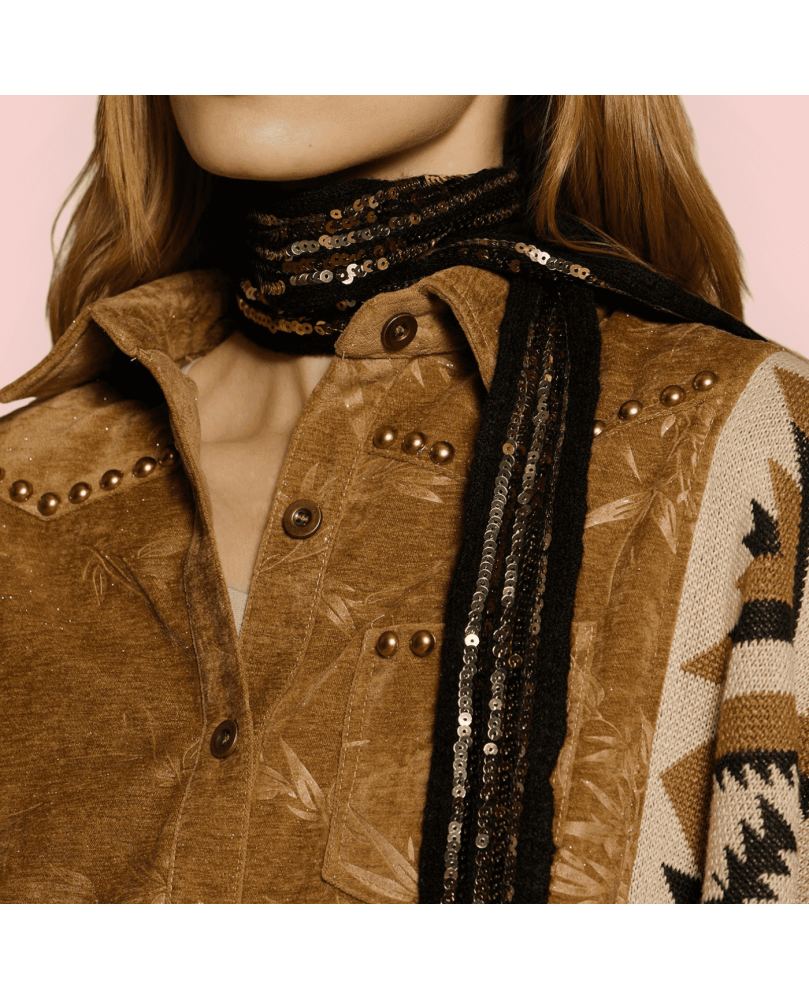 Pañuelo Meisie estilo collar es de tejido de punto en color negro con lentejuelas doradas.