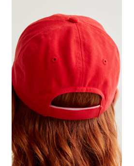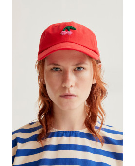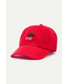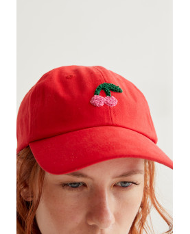 Gorra en color rojo con bordado de cerezas. Ajustable en la parte trasera con un velcro