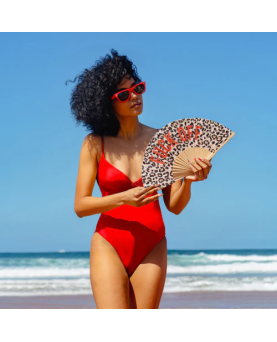 Con su estampado de leopardo y sus letras rojas es perfecto para darle a tus “looks" veraniegos un toque de cañero. Además, incluye un práctico colgador para que puedas tenerlo siempre a mano y que no se te pierda ni se te olvide. ¡Cuélgatelo y olvídate de rebuscarlo en tu bolso o mochila cuando necesites abanicarte!.