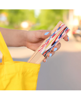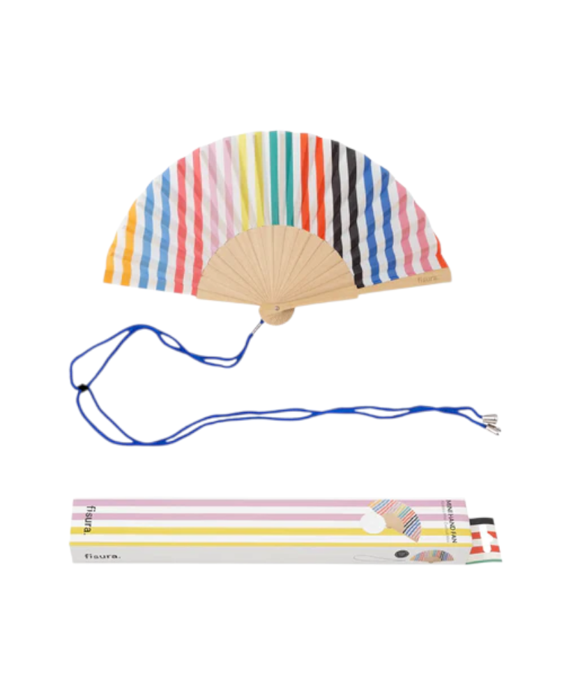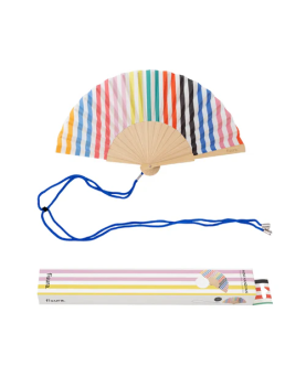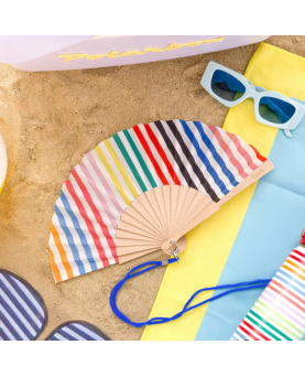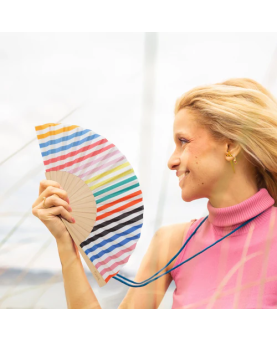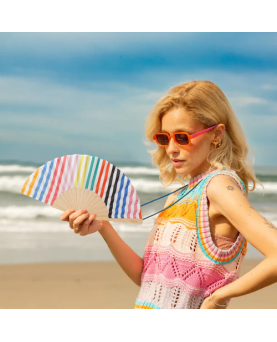 El abanico mini tiene un tamaño de 19 cm x 3 cm cuando está cerrado por lo que es ideal para llevarlo en cualquier bolso pequeño, riñonera, mochila o bolsillo del traje. Y, con su estampado de rayas multicolor le dará a tus looks veraniegos un toque de alegría y color que llamará la atención allá donde vayas.