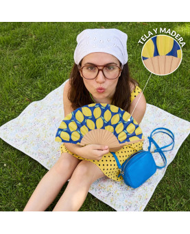 Medidas del abanico abierto: 42,5 cm de largo x 23 cm de alto Fabricado en textil y madera sostenible con certificado FSC.