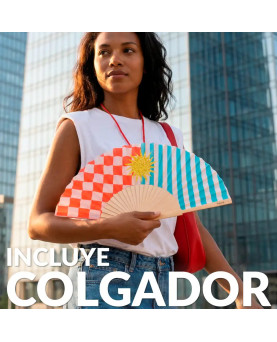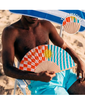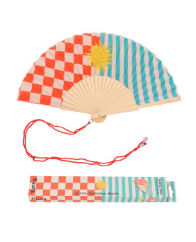 Este abanico con estampado de rayas, cuadros y un brillante sol de purpurina es ideal para darle a tus looks veraniegos un toque de alegría y color que te hará llamar la atención allá donde vayas. Además, incluye un práctico colgador para que puedas tenerlo siempre a mano y que no se te pierda ni se te olvide. ¡Cuélgatelo y olvídate de rebuscarlo en tu bolso o mochila cuando necesites abanicarte!