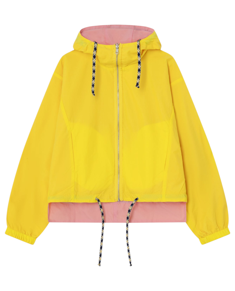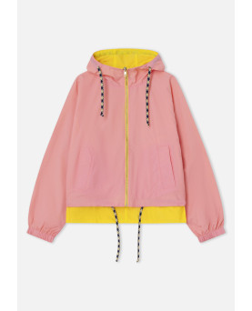 Chaqueta reversible en delicado tono rosa y amarillo vibrante que ilumina cualquier look. Su diseño ligero y cómodo la convierte en la aliada perfecta para entretiempo y días cambiantes. Cuenta con capucha ajustable, cierre frontal con cremallera, bolsillos laterales y cordones ajustables, que aportan un toque divertido y desenfadado. Los puños elásticos y el bajo ajustable aseguran comodidad. Una prenda versátil, alegre y funcional, ideal para llevar con vestidos, pantalones o faldas y dar un giro de color a tus looks diarios.