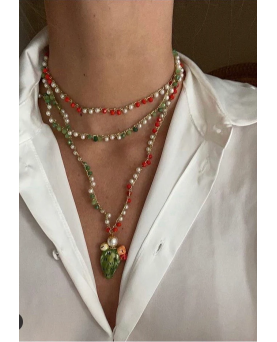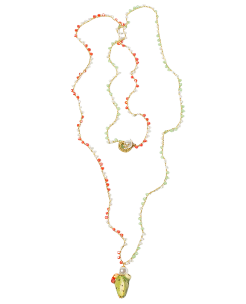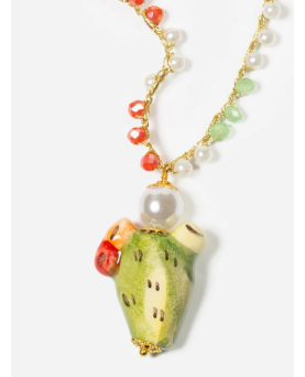 Collar Cashfana. Cadena tejida a mano con hilo de oro. Piedra zirconita de colores y perlas. Cactus realizado en cerámica siciliana de Caltagirone y perla natural. Puedes llevarlo corto o largo.
