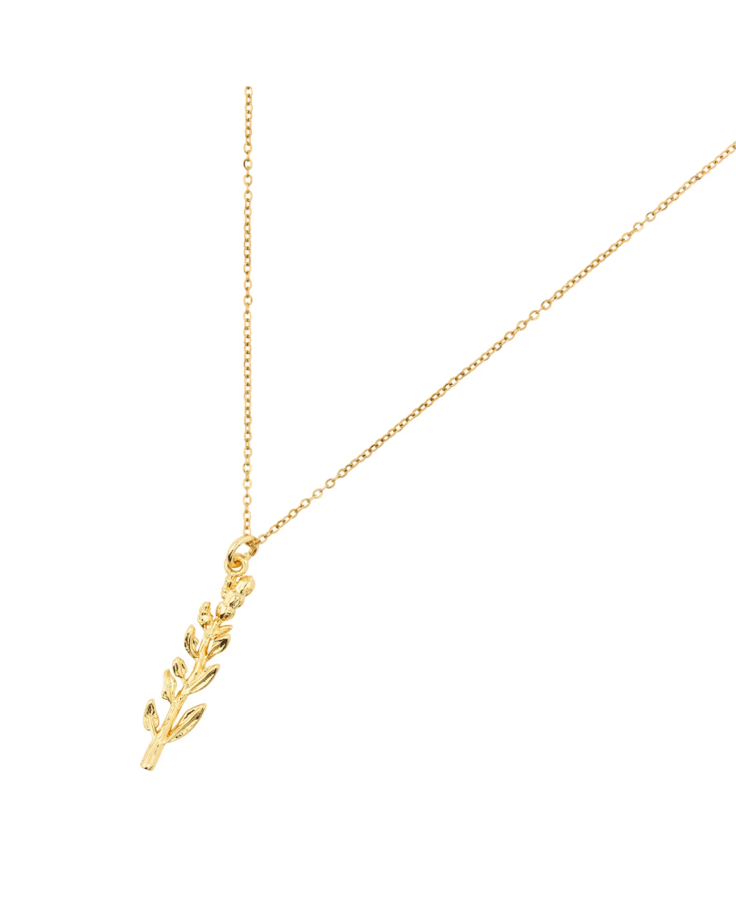 El colgante muestra detalles intrincados, desde las hojas elegantemente curvadas hasta los brotes texturizados en la parte superior. Suspendido de una cadena de oro retorcida, esta pieza logra un equilibrio perfecto entre la belleza natural y la sofisticación refinada, lo que lo convierte en el complemento ideal para nuestro bolso de cuero vegano "Beauty in Common Things".