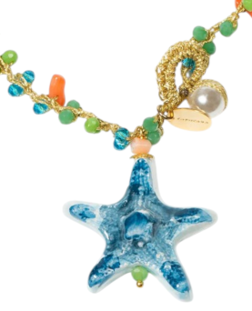 Colgante largo con dos estrellas de mar . La cadena está tejida a mano con hilo de oro y piedra circonita de colores verdes y azules y colares naranja.