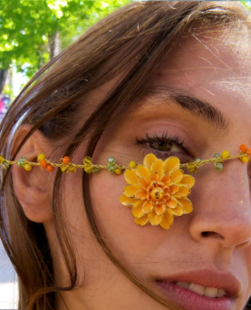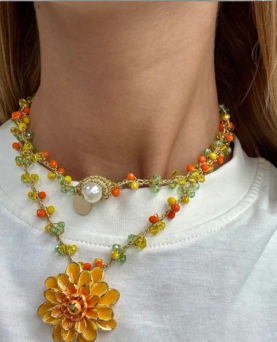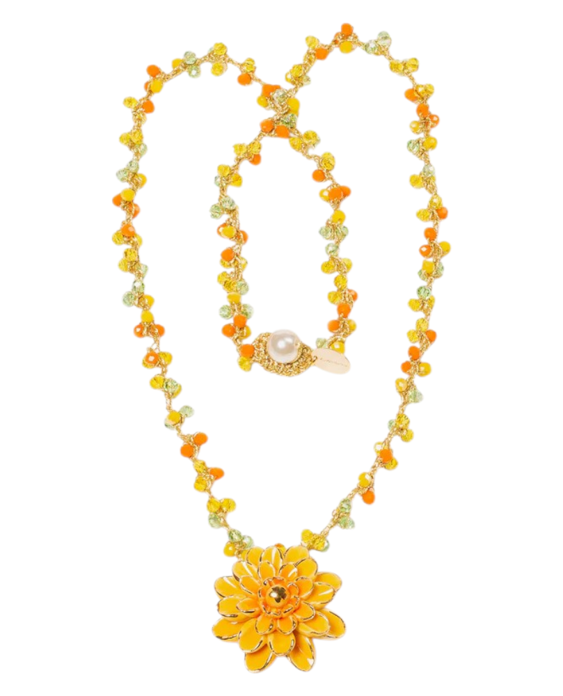 El colgante largo Sofía tiene una preciosa Dalia de color amarillo cálido. La cadena de hilo dorado está entretejida con cristales amarillos, verdes y naranjas.