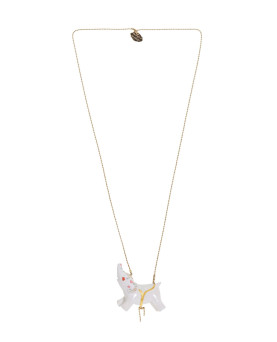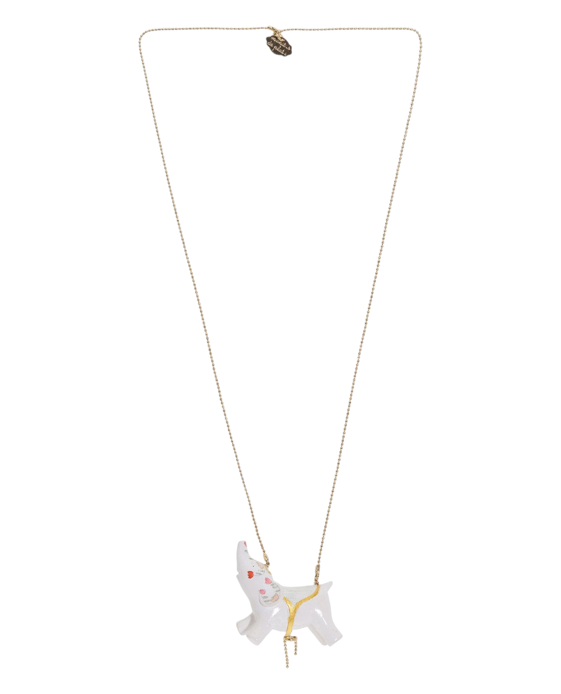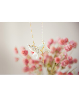 Ficha técnica: – Pieza modelada y pintada a mano. – Realizada con cerámica fría de 5 cm de largo – La cadena lleva un baño de oro antialérgico de 33 cm de largo – Es una pieza muy ligera (23,2 gramos) y muy resistente