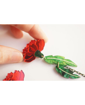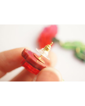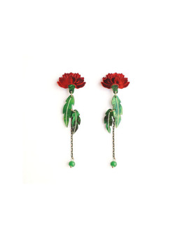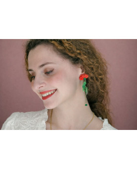Estos pendientes combinan el clavel con el movimiento ligero de las hojas y la caída sutil de una cuenta verde. Ligeros, luminosos y coloridos.