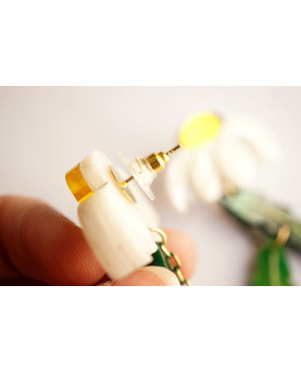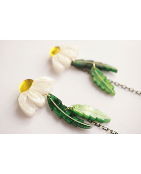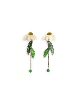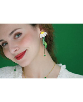 Estos pendientes combinan la margarita con el movimiento ligero de las hojas y la caída sutil de una cuenta verde. Esta pieza evoca la frescura de un paseo entre campos, donde todo florece con calma. Ligeros, luminosos y llenos de vida.