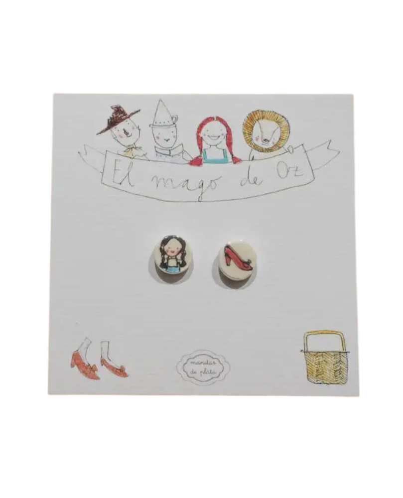 Dorothy, el espantapájaros, el hombre de hojalata y el león cobarde. Todos en el packaging de estos pendientes de Dorothy y sus preciosos zapatos rojos