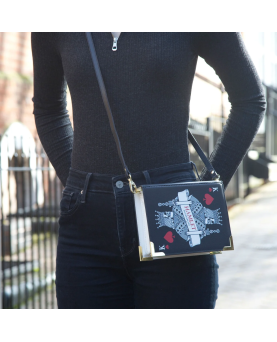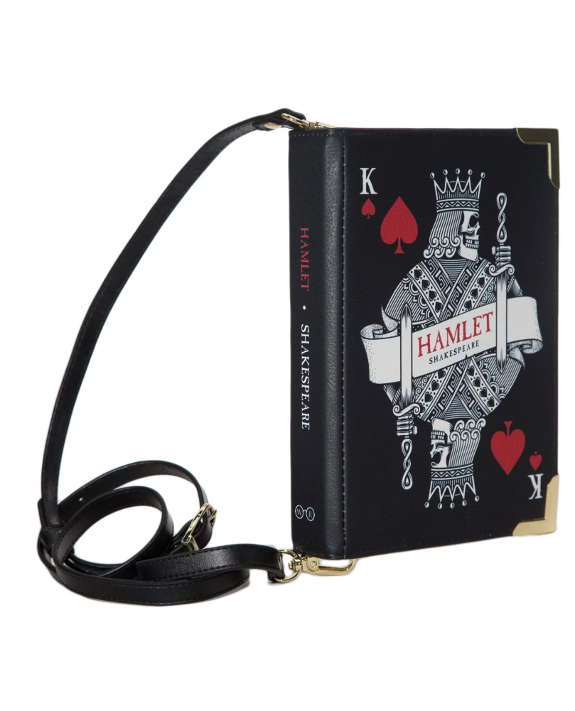 Celebre su admiración por Hamlet de Shakespeare con este hermoso bolso de mano elaborado con cuero vegano. Con un llamativo diseño de naipes con figuras con caras de calaveras, este bolso de mano negro seguramente llamará la atención. La parte posterior del bolso está decorada con la clásica cita: " Ser o no ser, esa es la cuestión". ¡ El accesorio perfecto para la academia oscura!