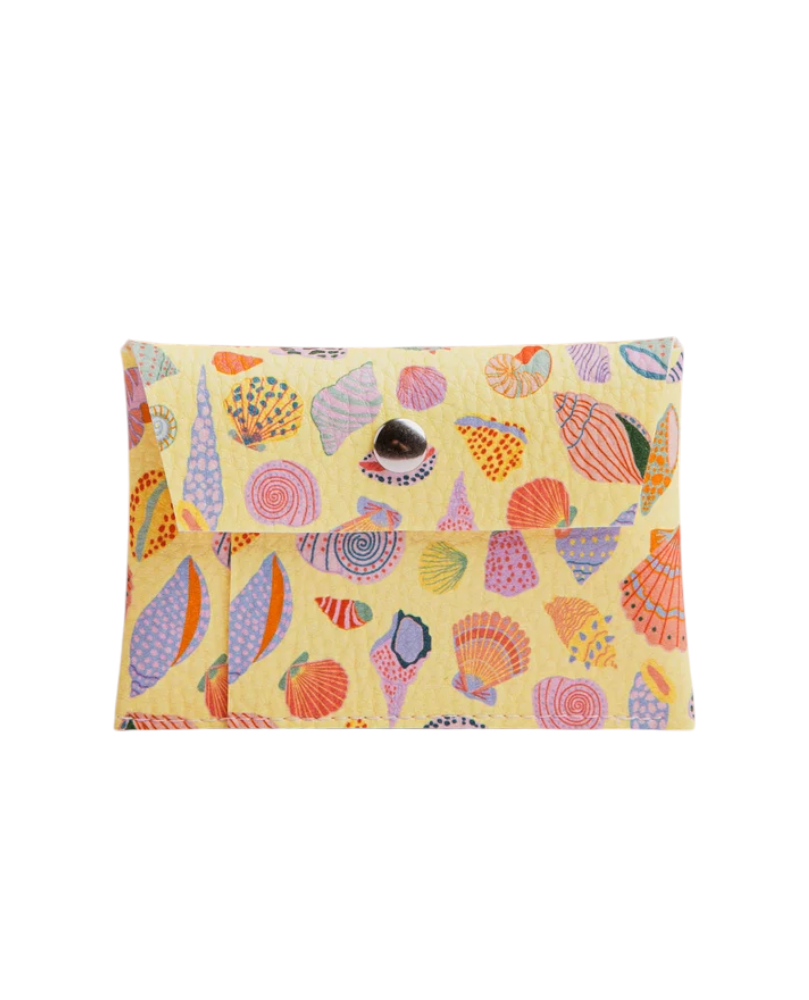 Tarjetero con estampado de conchas sobre fondo amarillo