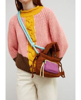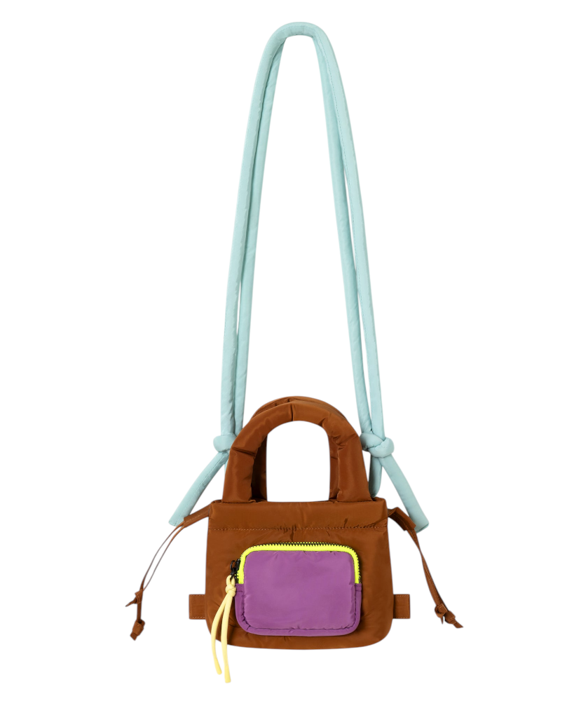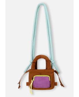 Divertido y versátil, perfecto para cualquier plan. Bolso pequeño acolchado color marrón. Ideal para llevar tanto en la mano como al hombro disponiendo de asa corta y asa larga en contraste color agua. Bolsillo frontal color lila, detalle de cremallera con acabado neón y tirador amarillo. Dispone de cierre de cremallera superior, ideal para el día a día.