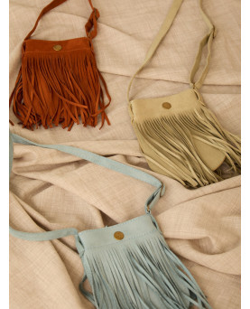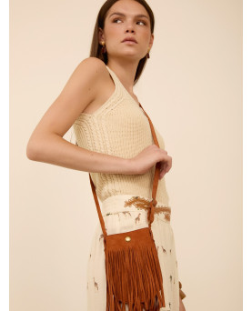 Bolso pequeño de ante con flecos. Con correa ajustable. Color teja