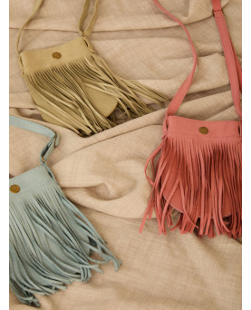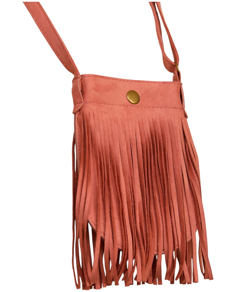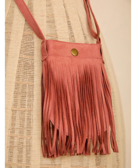 Bolso pequeño de ante con flecos. Con correa ajustable. Color rosa