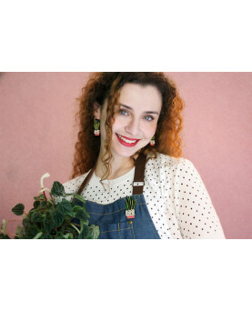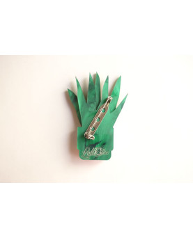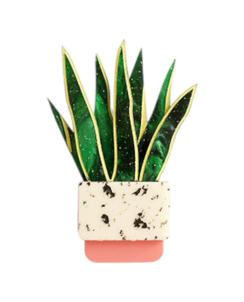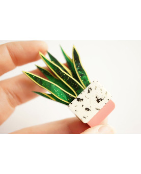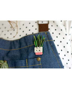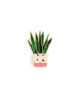 Broche ilustrado de una sansevieria en maceta, con un diseño lleno de pequeños detalles. Una pieza fresca y versátil, perfecta para dar un toque natural a tu look. Un toque verde que siempre acompaña